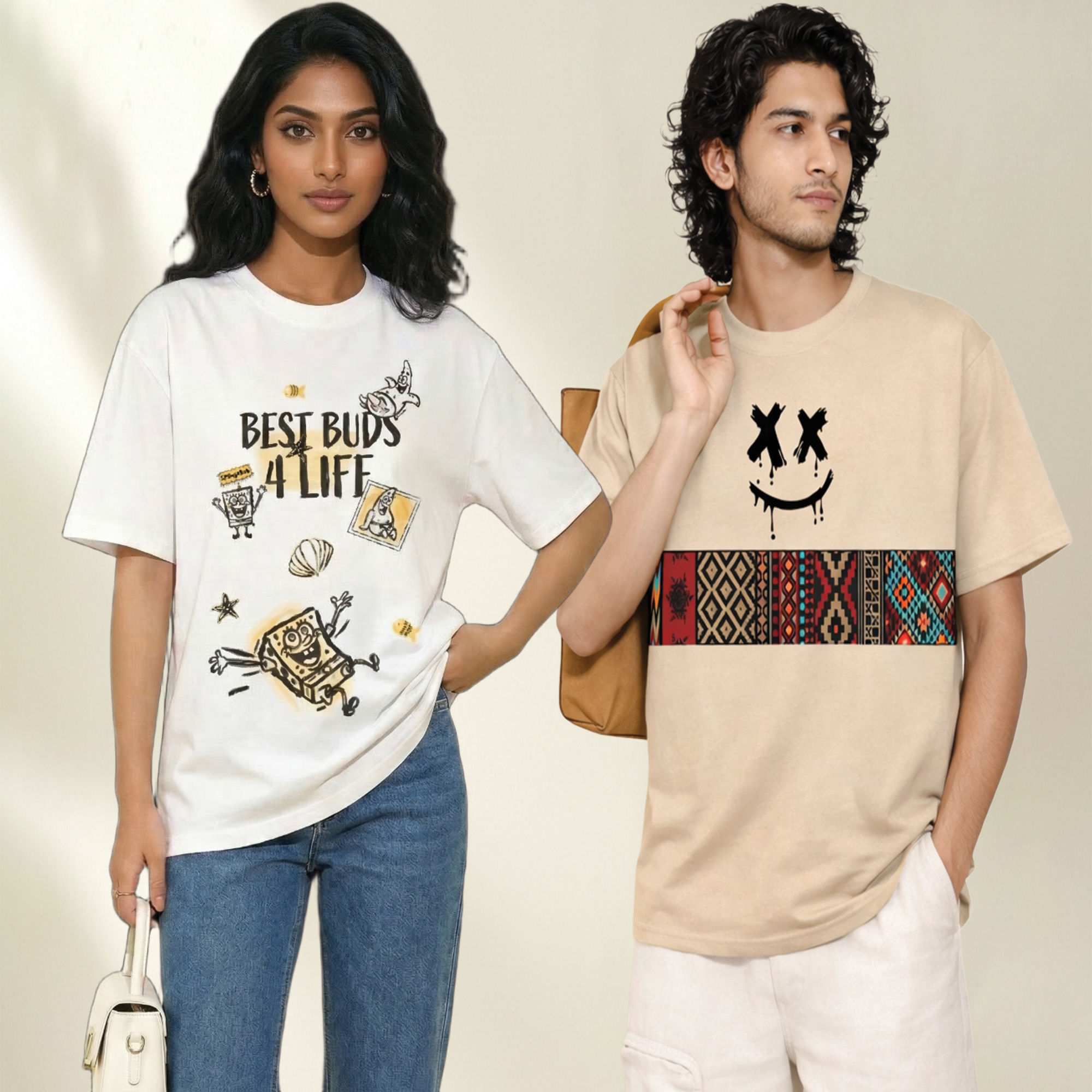 Women White Oversized Graphic T-Shirt – Best Buds & Friends Under the Sea Cartoon Print | Premium Cotton Tee