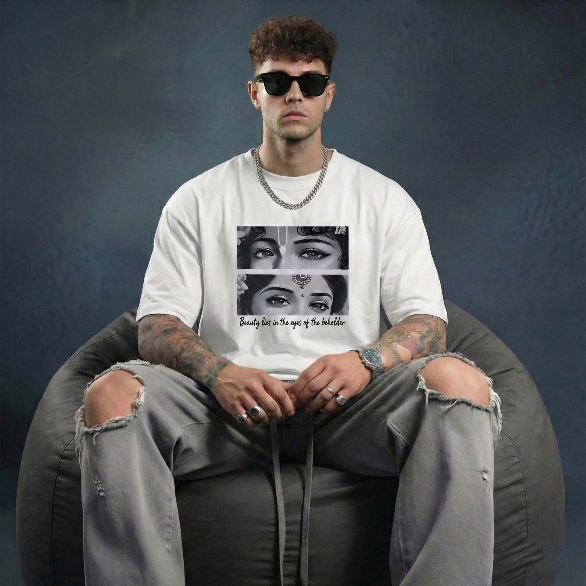 This Beauty Lies Graphic T-Shirt for Men features a striking dual-eye artwork inspired by classical Indian aesthetics, paired with the powerful quote: