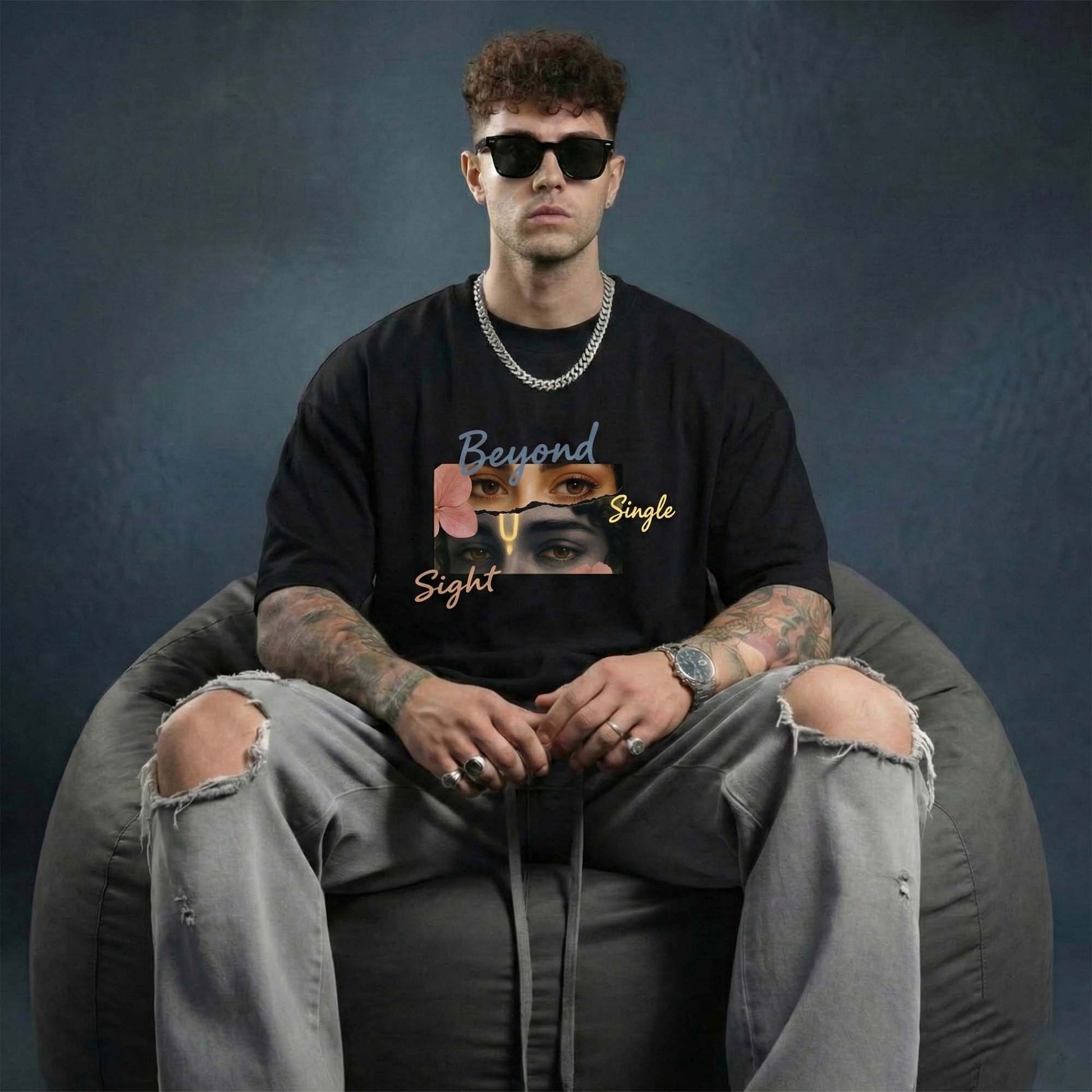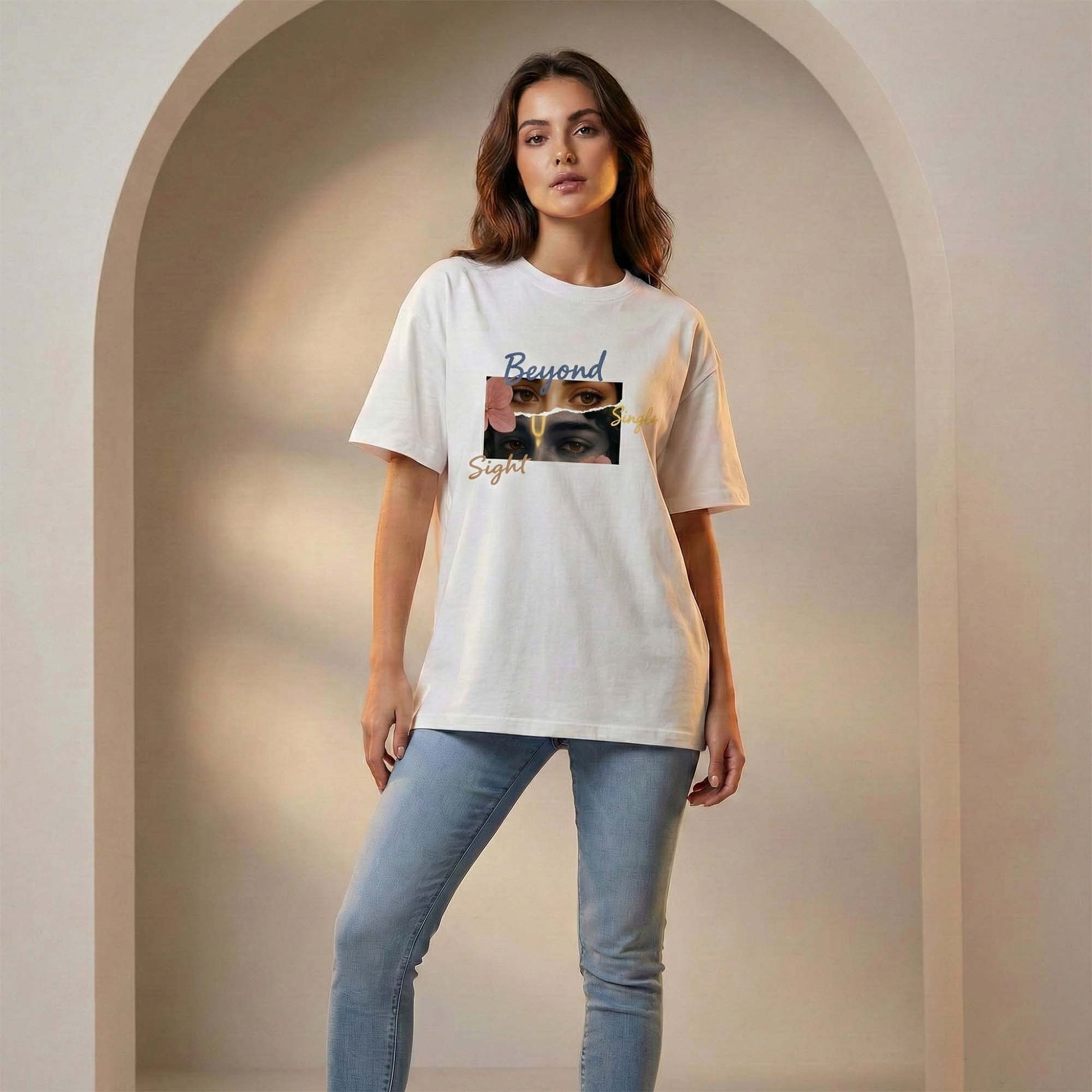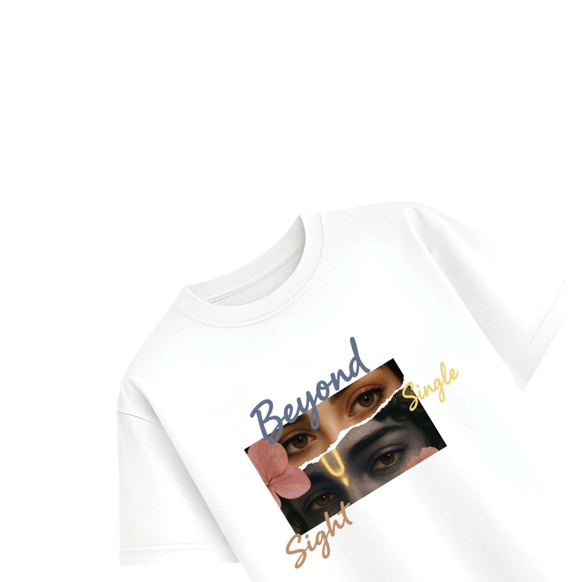 The Beyond Single Sight Graphic T-Shirt represents deeper perception — a fusion of human emotion and spiritual awareness. The layered eye artwork with soft floral elements creates a calm yet powerful aesthetic.