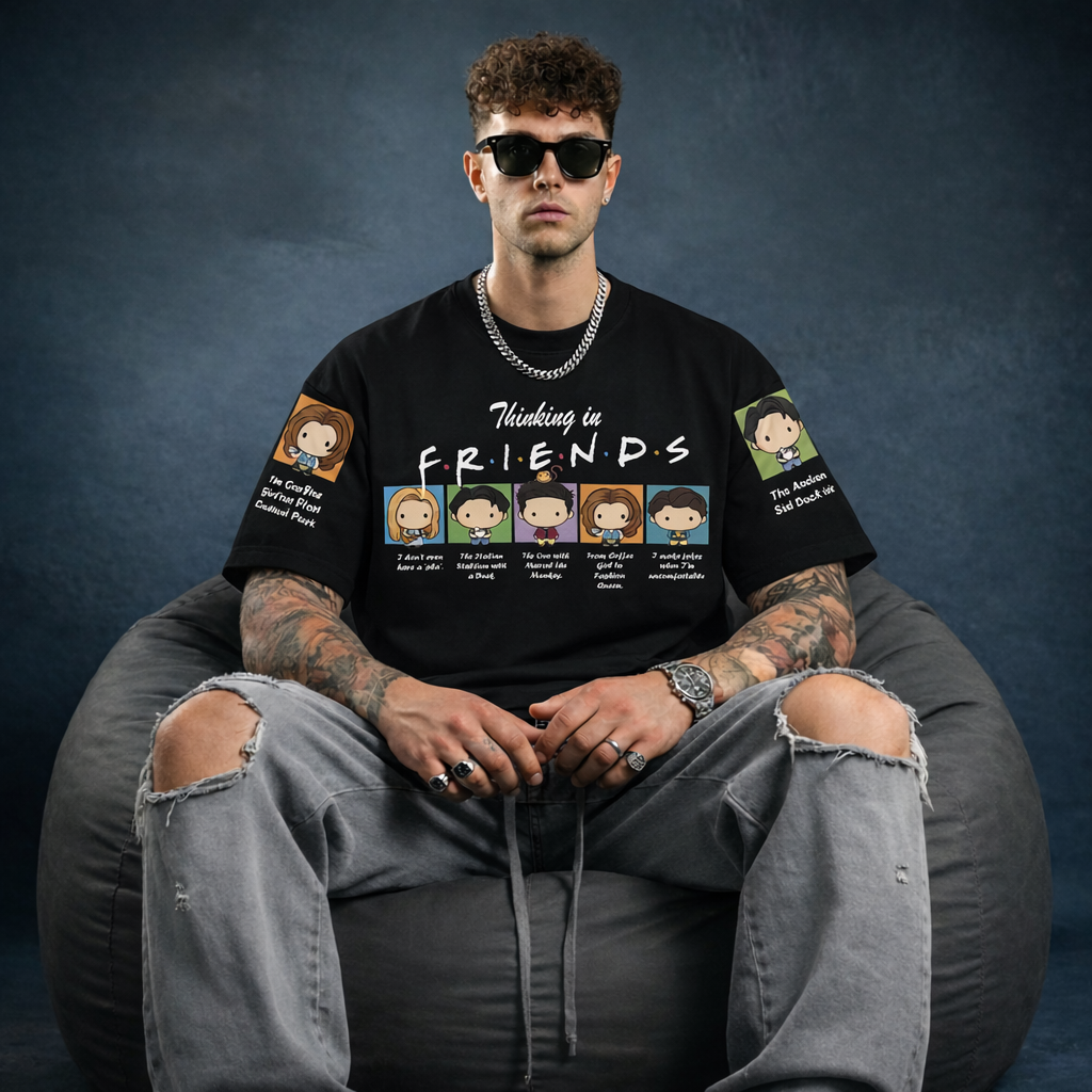 Thinking in Friends Graphic Oversized T-Shirt for Men | Funny Cartoon Friends Printed Cotton T-Shirt