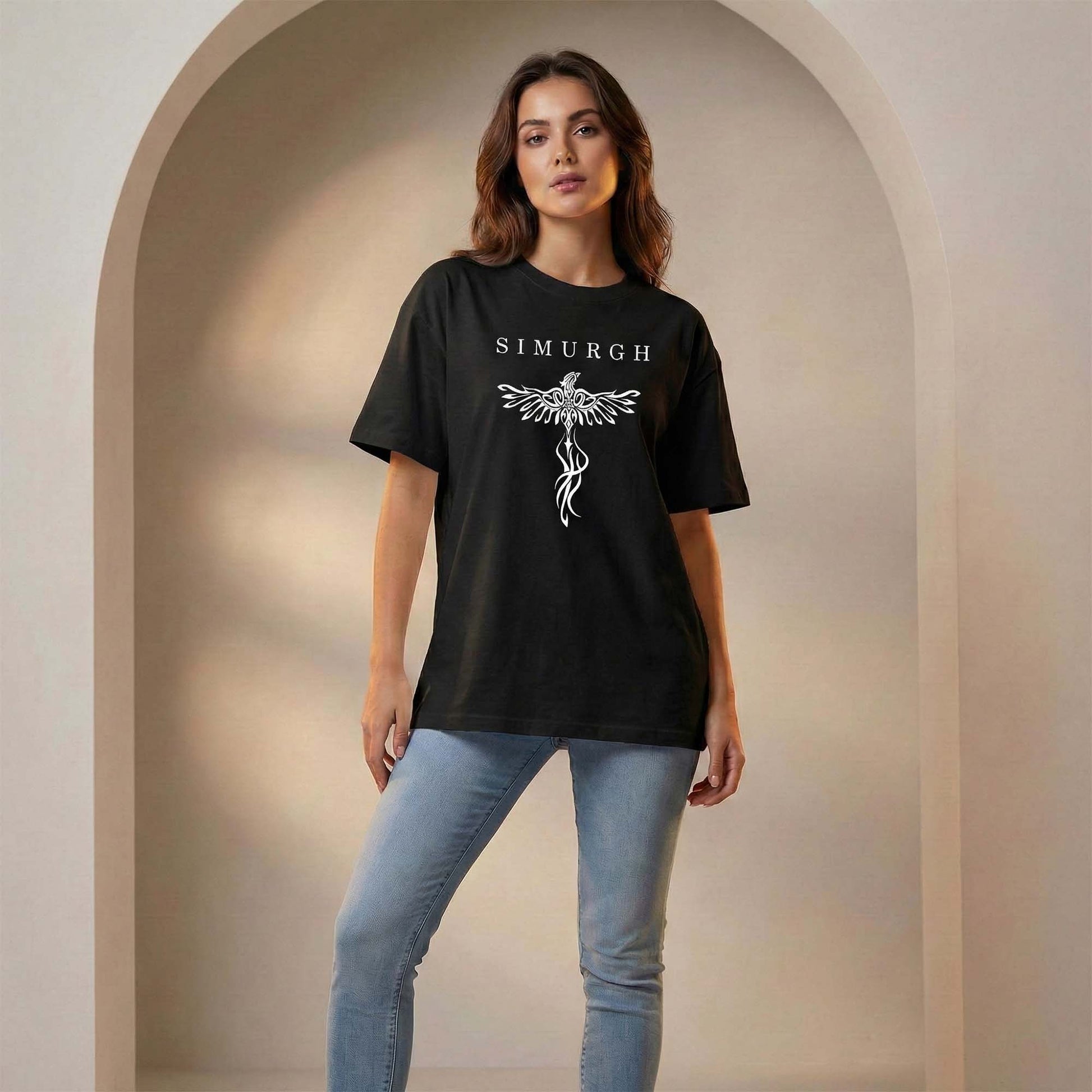 Women Black Oversized Graphic T-Shirt – Simurgh Phoenix ‘Hope Rises from Ashes’ Print | Premium Cotton Tee